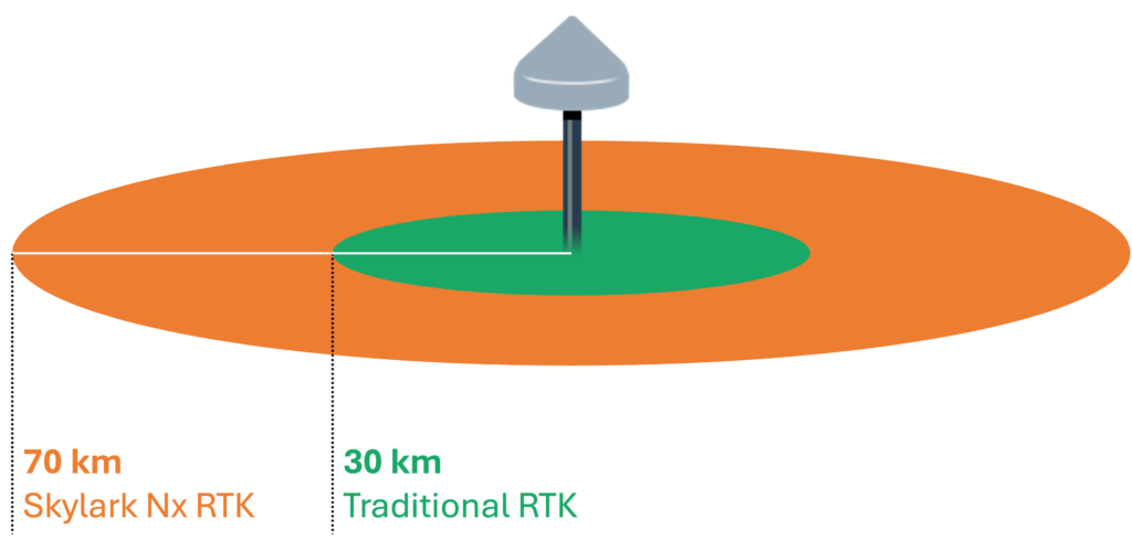 Skylark Nx RTK delivers RTK accuracy up to 70 km from the nearest reference station.