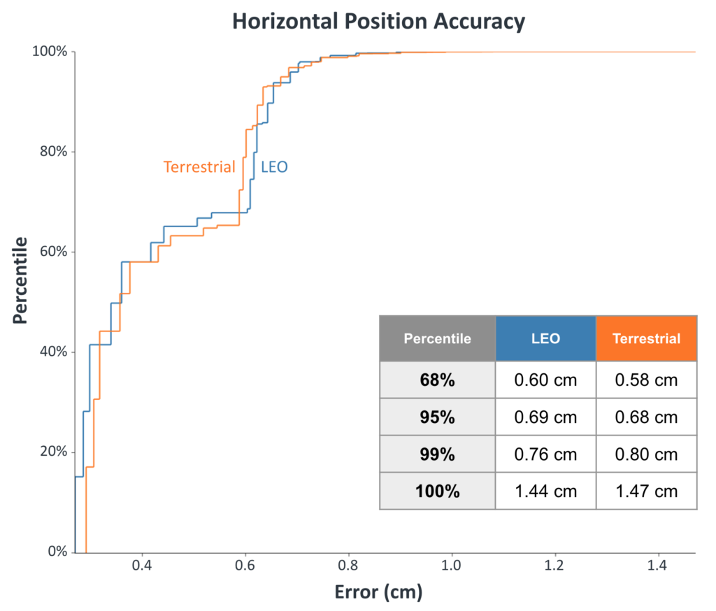 The CDF of horizontal position error (below) shows the two curves—LEO (Starlink) and terrestrial (Ethernet)—overlapping almost perfectly, each staying within 1.5 cm for the full duration (and within 0.7 cm at the 95th percentile). This confirms that LEO broadband can sustain full-rate RTK corrections with centimeter-level accuracy indistinguishable from terrestrial network performance.