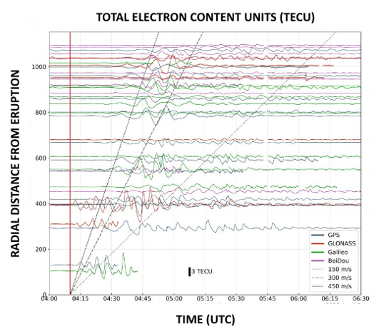 This chart shows the effects of a volcanic eruption that sent ripples through the earth’s ionosphere. You can see the impact on the satellite signals moving from the epicenter of the eruption outward, and how those signals change over time.