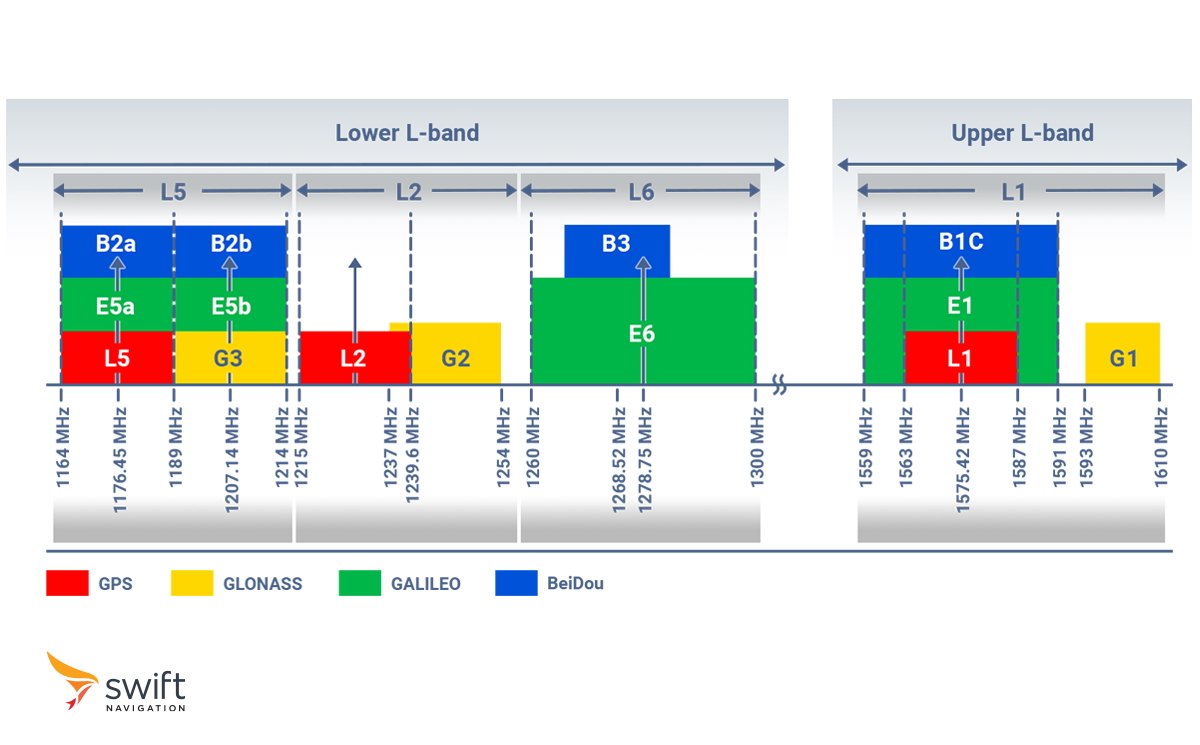 GNSS satellites transmit their signals at certain frequencies. These frequencies lie within the L-band of the radio spectrum (1-2 GHz). Subsections of the L-band used by GNSS are referred to as L1, L2 and L5, each of which offering its own balance of signal strength and atmospheric penetration.