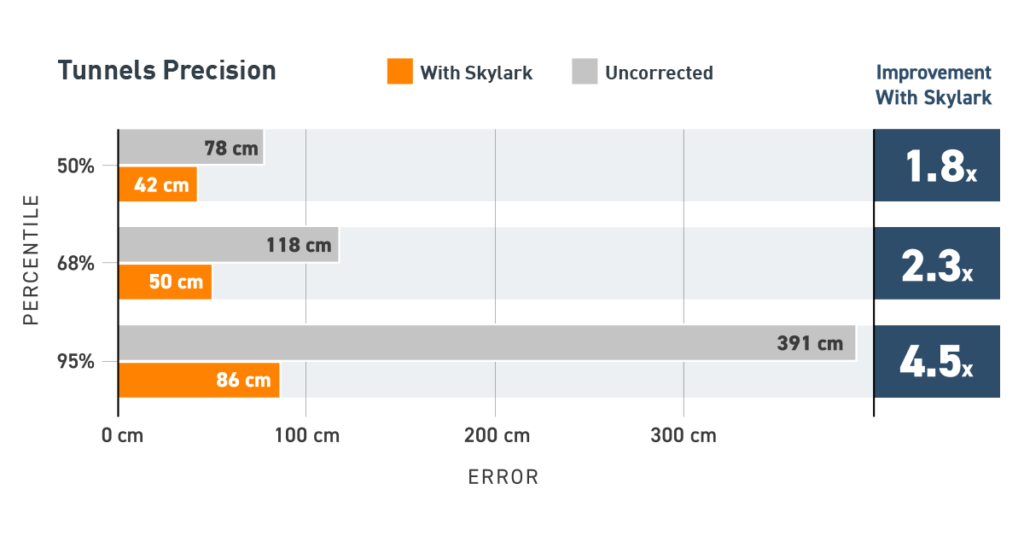 The results for tunnel exits were even more striking. Uncorrected GNSS only achieved an accuracy of 3.91 m (95%), making it an entirely unreliable solution. Skylark’s accuracy was 86 cm (95%), thanks to its fast re-convergence time.
